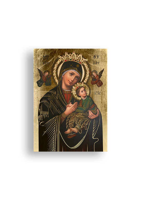 Ikona religijna przedstawiająca wizerunek Matki Bożej Nieustającej Pomocy. Wykonana z najwyższej jakości materiałów oraz wizerunek został naniesiony na ręcznie złoconą deskę.